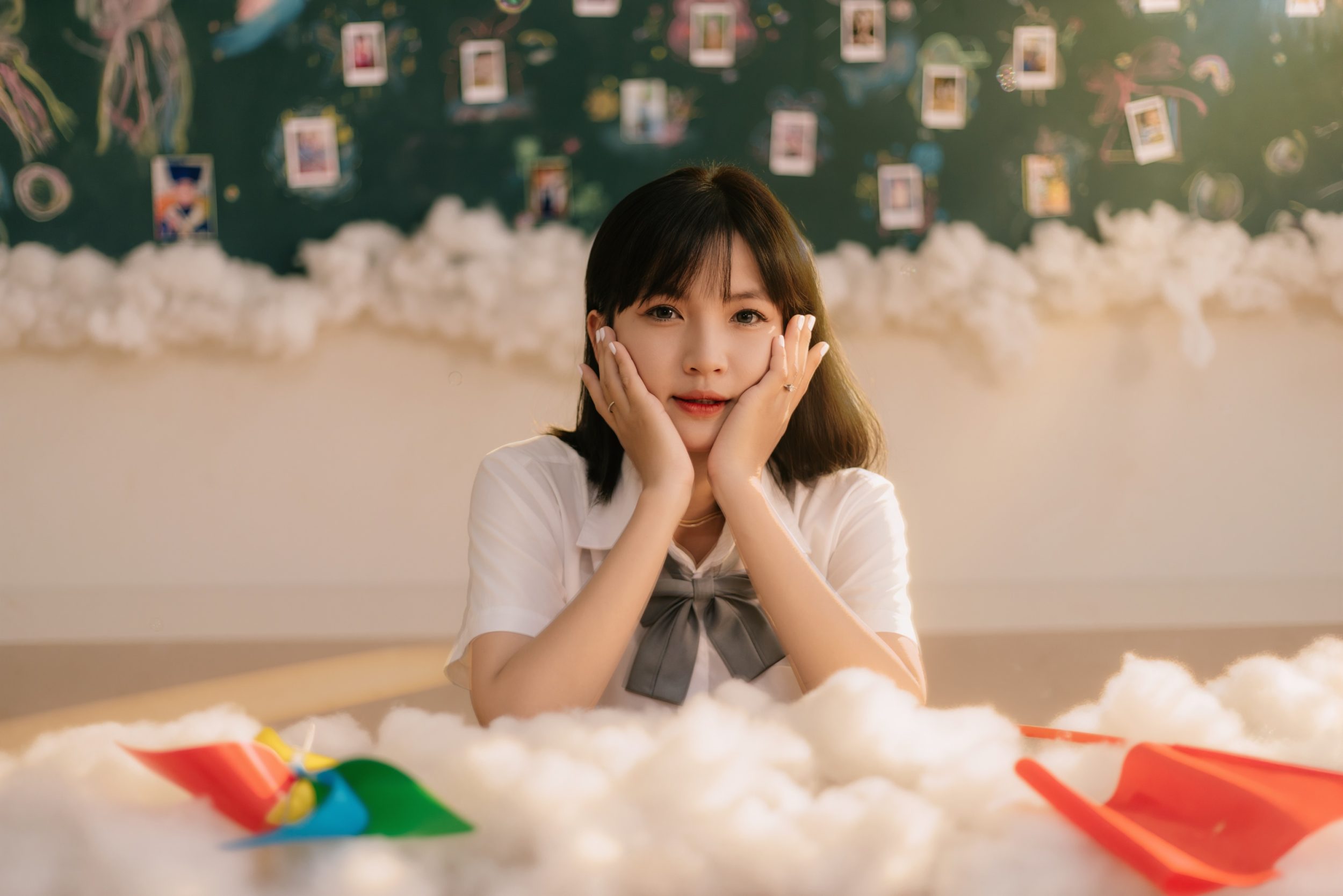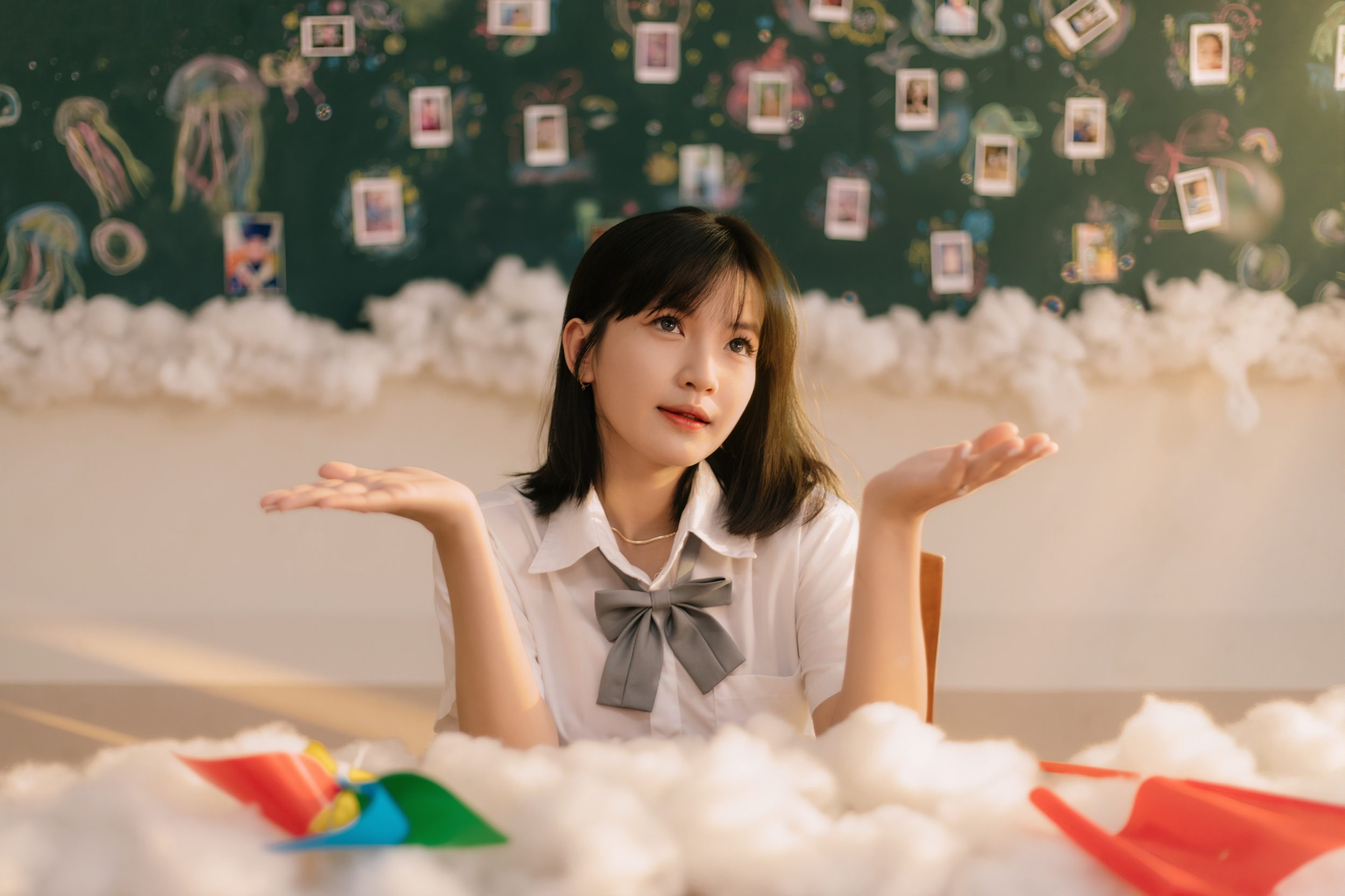 Không cần quá nhiều đạo cụ; chỉ cần hoa trắng, bóng pastel hoặc bảng mini. Đạo cụ ít nhưng đúng tone giúp ảnh sạch, không rối bố cục. Điều đẹp nhất vẫn là nụ cười và biểu cảm thật. Cảm xúc tự nhiên luôn mạnh hơn mọi phụ kiện đi kèm.