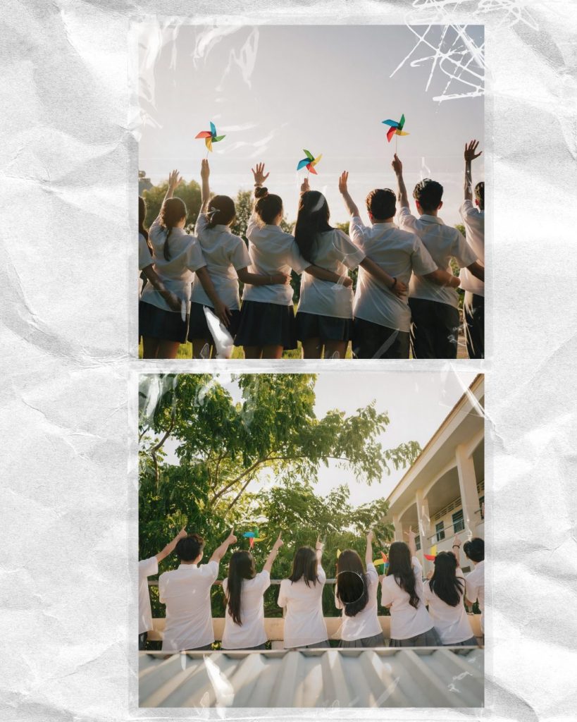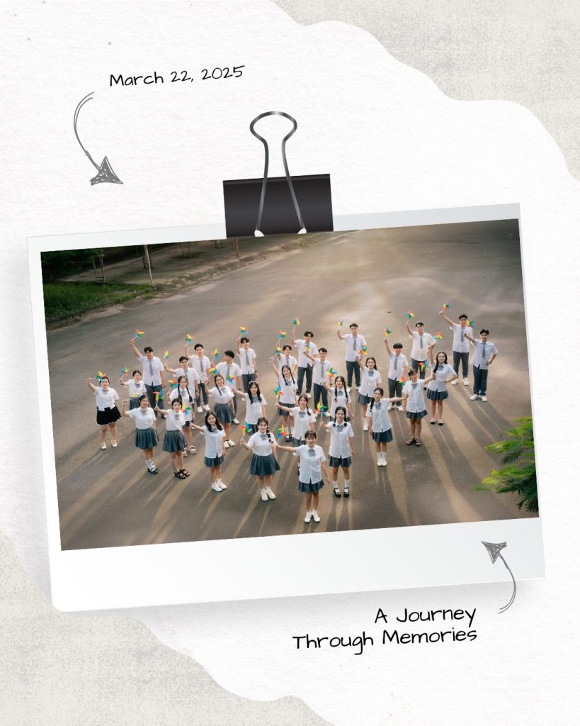 Cảnh “đứng nghiêm 2 giây rồi phá” cũng cực hiệu quả. Lớp đứng nghiêm túc như ảnh kỷ yếu truyền thống, rồi một bạn làm tín hiệu, cả lớp bật cười hoặc làm một động tác đồng bộ (vẫy tay, giơ mũ, khoác vai). Sự chuyển đổi từ nghiêm sang vui tạo điểm nhấn mạnh, đúng kiểu trend chụp hình kỷ yếu mà xem lại vẫn thấy vui.