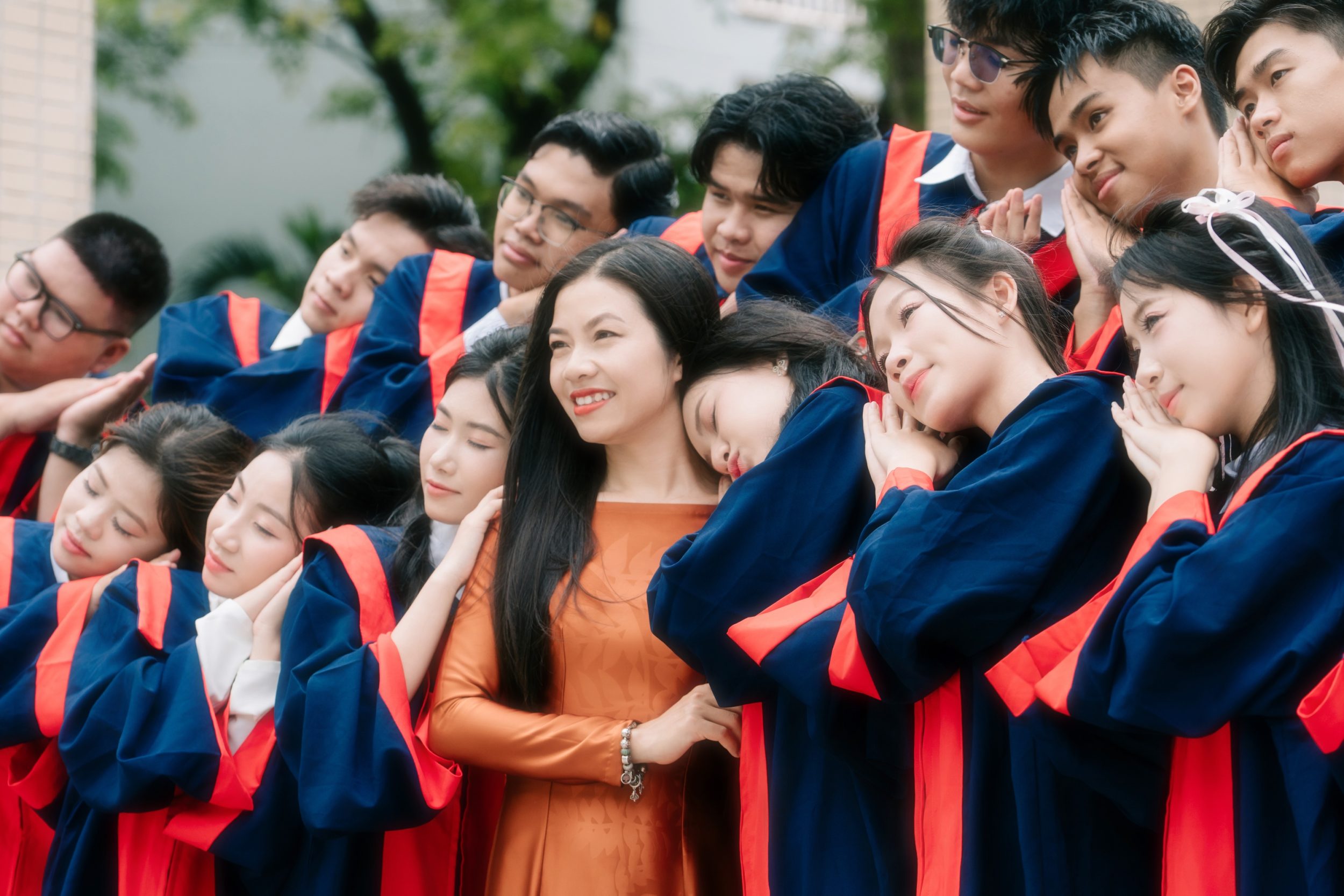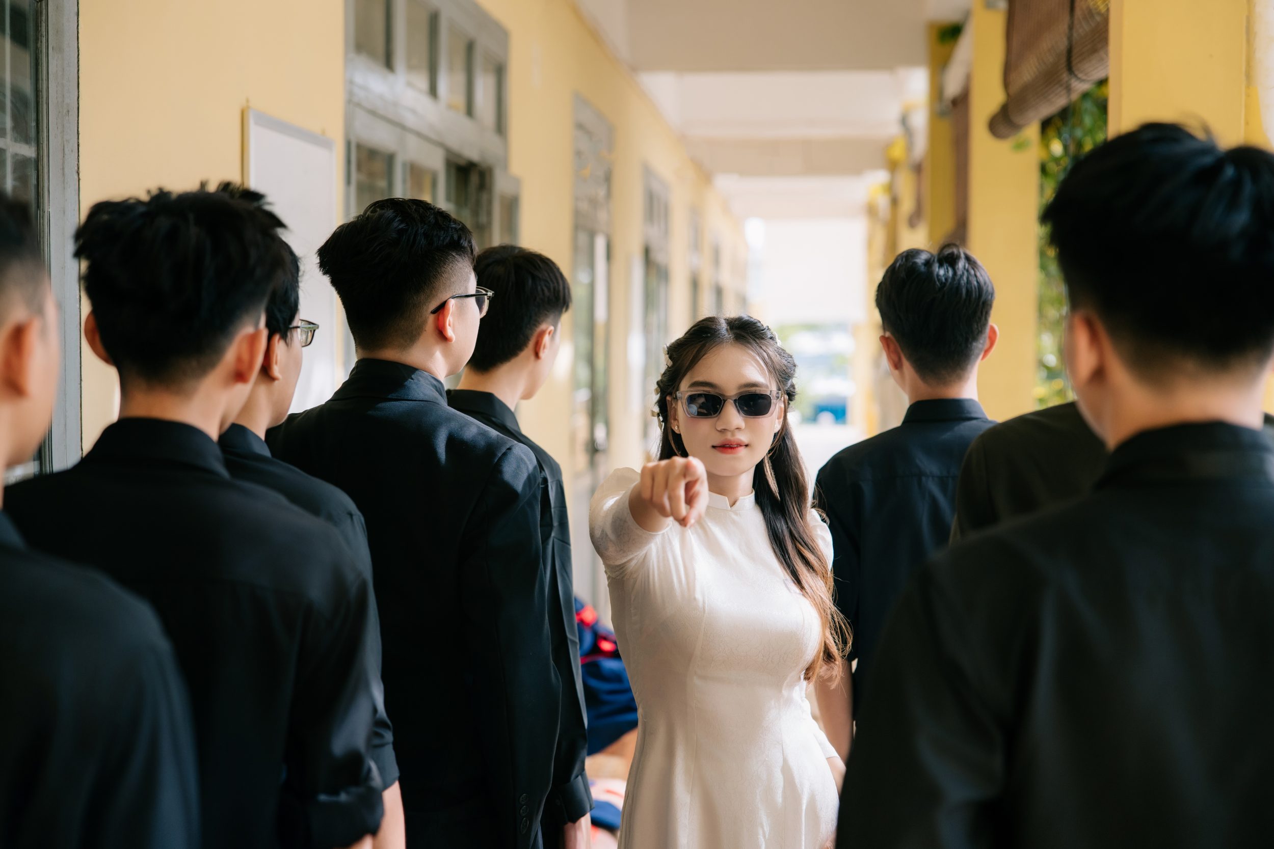 Không ép buộc tạo dáng phức tạp, ekip hướng dẫn từng nhóm, từng bạn theo dáng tự nhiên nhất. Những động tác nhẹ như nghiêng đầu, bước nhỏ, chạm vai hay quay sang cười luôn được ưu tiên. Cách làm việc thân thiện giúp lớp thoải mái và nhiều moment đẹp hơn.