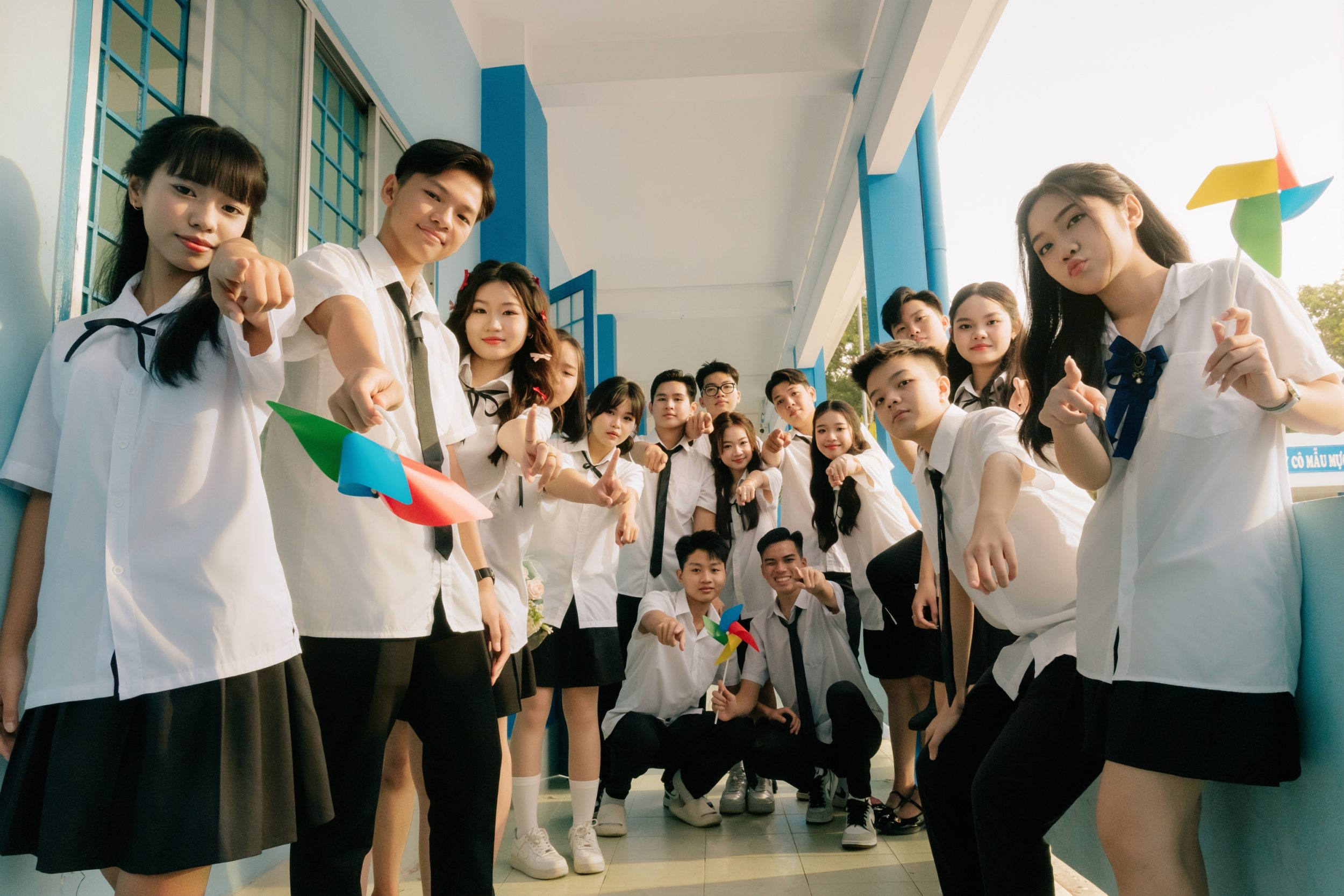 Tại Phú Giáo, lớp THPT Phước Vĩnh chọn sân trường làm bối cảnh vì muốn giữ trọn tinh thần học đường. Gió thổi nhẹ làm tóc bay, nắng xuyên qua tán cây tạo nên tone ảnh ấm nhưng trong. Buổi chụp ảnh kỷ yếu Bình Dương của lớp rất tự nhiên: chạy, cười, đứng nhóm hoặc cùng nhìn về phía bảng đen quen thuộc. Không cầu kỳ nhưng lại đầy cảm xúc. Những bức ảnh ấy ghi lại đúng bản chất của lớp – vô tư và chân thành. Trạm Thanh Xuân hân hạnh đồng hành cùng các bạn lưu giữ thanh xuân ấy.