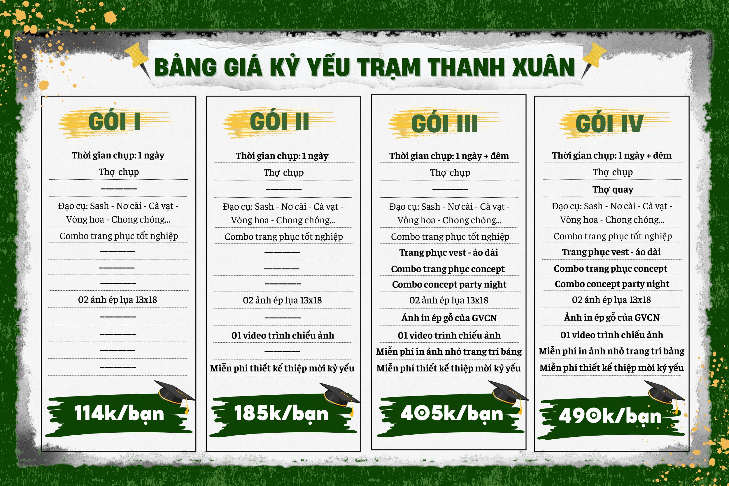 Nếu lớp bạn đang chuẩn bị chụp kỷ yếu và cần tư vấn từ trang phục, makeup đến kiểu tóc kỷ yếu đẹp, Trạm Thanh Xuân luôn sẵn sàng đồng hành với giải pháp trọn gói: tặng miễn phí 1 concept khi đặt 1 concept, miễn phí toàn bộ trang phục cho cả lớp, miễn phí giáo viên chủ nhiệm & người thân chụp cùng, hỗ trợ thử đồ tận nơi – nhận đồ trước ngày chụp, giảm ngay 50% khi đặt lịch sớm. Toàn bộ ảnh được AI hỗ trợ chỉnh ảnh cho học sinh, kèm hợp đồng dấu đỏ và nhãn hiệu®, để mỗi mùa kỷ yếu đều trở thành một ký ức trọn vẹn.