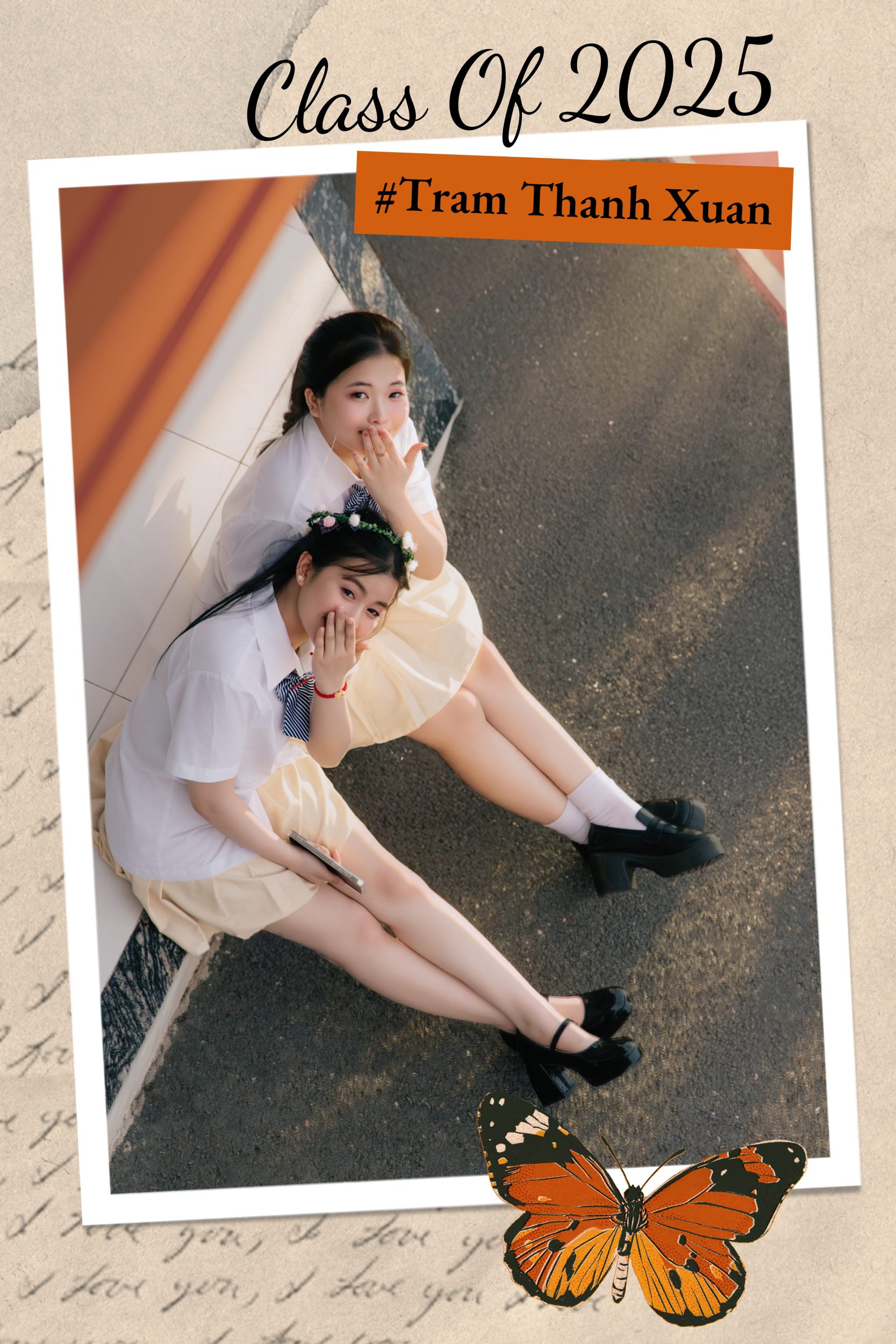 Nếu bạn muốn cách tạo dáng chụp hình kỷ yếu nhẹ nhàng hơn, hãy chụp dáng ngồi. Dáng ngồi thường giúp mặt mềm và cảm xúc dịu. Dáng 1: ngồi bậc thang nghiêng 45 độ, hai chân xếp nhẹ sang một bên, lưng thẳng. Dáng 2: ngồi bệt, một chân co nhẹ, một chân duỗi, tay đặt lên đầu gối, nhìn xuống rồi cười.