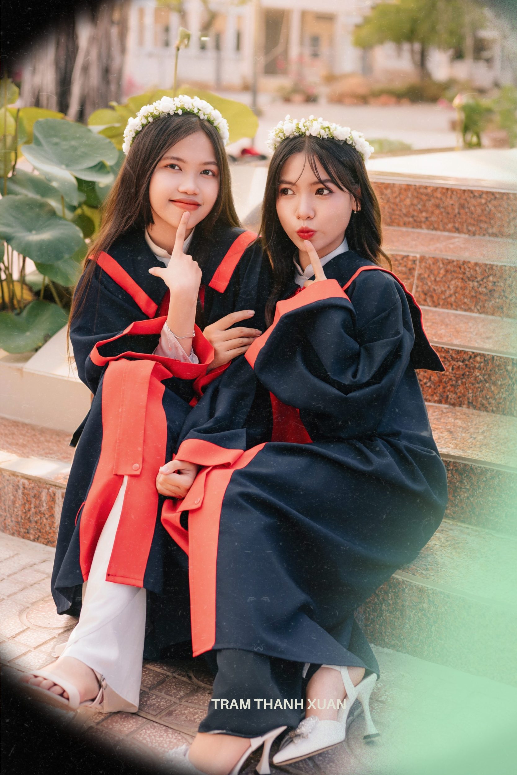 Đồng phục & áo cử nhân: ưu tiên gọn gàng, giữ form, tết/buộc vừa đủ để ảnh nhóm sạch và sang