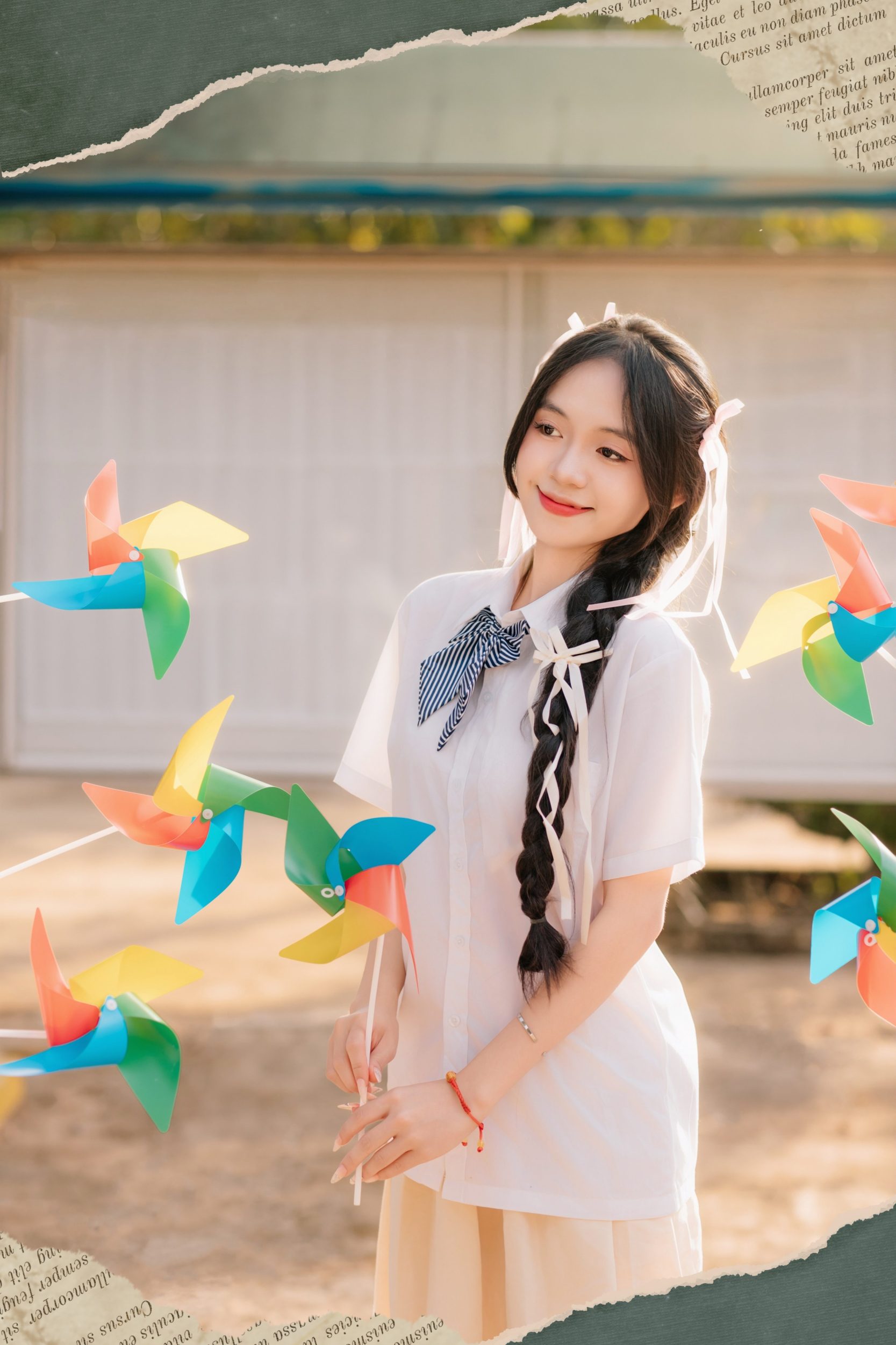 Với mặt vuông hoặc góc hàm rõ, tóc kỷ yếu đẹp nhất là tóc tạo cảm giác mềm mại quanh viền mặt. Thay vì ép thẳng sát đầu, bạn nên ưu tiên uốn lơi hoặc tạo lọn ôm nhẹ ở phần tóc gần má và quai hàm. Mái bay dài cực hợp vì nó “đi qua” góc hàm và làm đường nét dịu lại trên ảnh. Khi chọn tết tóc chụp kỷ yếu đẹp, hãy tết theo kiểu lỏng, không siết chặt: tết lệch một bên, tết xương cá lỏng, hoặc tết nửa đầu để vẫn giữ độ phồng ở đỉnh. Tết quá chặt sẽ làm lộ khung xương mặt rõ hơn và khiến tổng thể “cứng”. Với buộc tóc chụp kỷ yếu, buộc thấp và kéo phồng nhẹ phần đỉnh đầu sẽ làm gương mặt thanh hơn, đồng thời giúp cổ và vai nhìn mềm. Bạn có thể thêm một kẹp nhỏ hoặc ruy băng mảnh (màu trung tính) để tạo điểm nhấn vừa đủ mà không bị “lố” khi nhìn lại album sau nhiều năm.